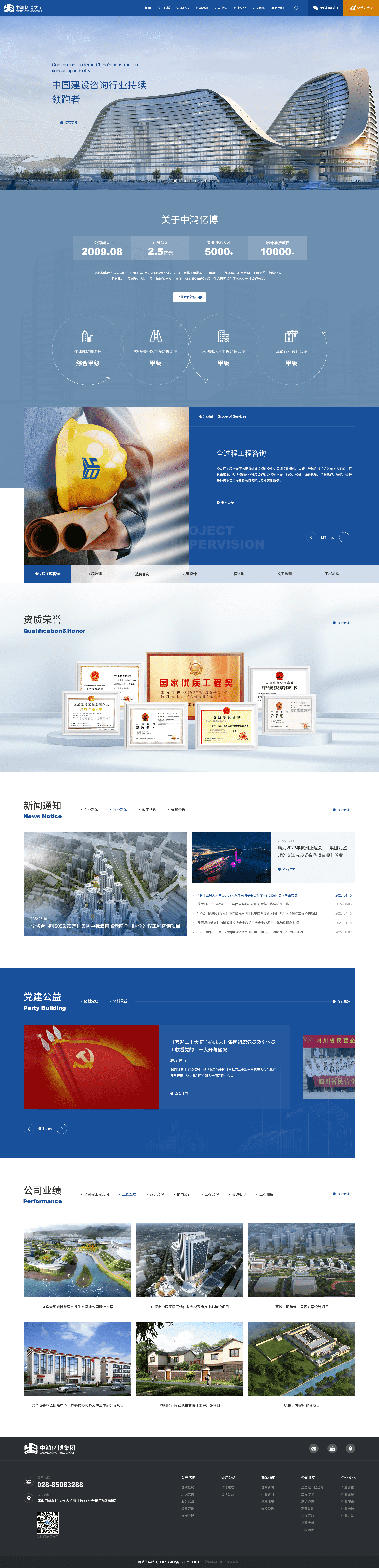中鴻億博集團(tuán)有限公司成立于2009年8月,注冊資金5000萬元,是一家集項(xiàng)目管理、工程監(jiān)理、造價(jià)咨詢、勘察設(shè)計(jì)、招標(biāo)代理、工程咨詢、工程測繪、人防工程、BIM咨詢及檢測鑒定于一體的全過程工程管理咨詢綜合服務(wù)商。并于2015年取得工程監(jiān)理綜合資質(zhì)、勘察設(shè)計(jì)資質(zhì);2016年取得工程造價(jià)咨詢甲級資質(zhì)、工程測繪丙級資質(zhì);2017年取得招標(biāo)代理甲級資質(zhì)、工程咨詢單位甲級資信證書;2018年取得軍工涉密業(yè)務(wù)咨詢服務(wù)安全保密條件備案證書;2020年4月取得水利部水利工程施工監(jiān)理甲級、水土保持工程施工監(jiān)理丙級;2020年7月取得交通運(yùn)輸部(全資子公司)公路工程甲級。