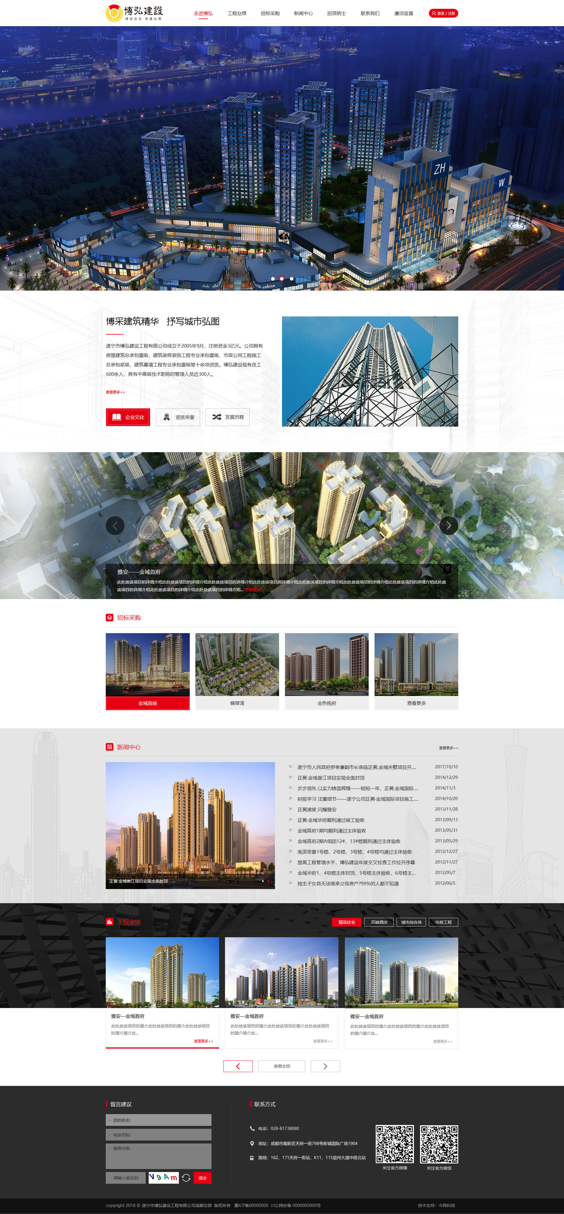 博弘建設(shè)立足西南,全力推進(jìn)全國(guó)化布局,成功進(jìn)駐華東、華南區(qū)域。先后成立成都、雅安、瀘州、西昌、宜賓、自貢、嘉興、臺(tái)州、四會(huì)、惠州等10余家分公司。全年在建項(xiàng)目30個(gè)以上,年施工建設(shè)面積400萬(wàn)方以上。