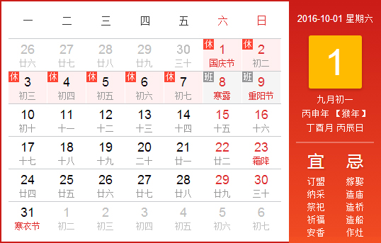 一、10月1日至7日放假調(diào)休,共7天;10月8日(星期六)、10月9日(星期日)上班。其中10月1日至3日為法定假日;10月4日、5日補(bǔ)休10月1日、2日;10月6日、7日調(diào)休10月8日、9日。