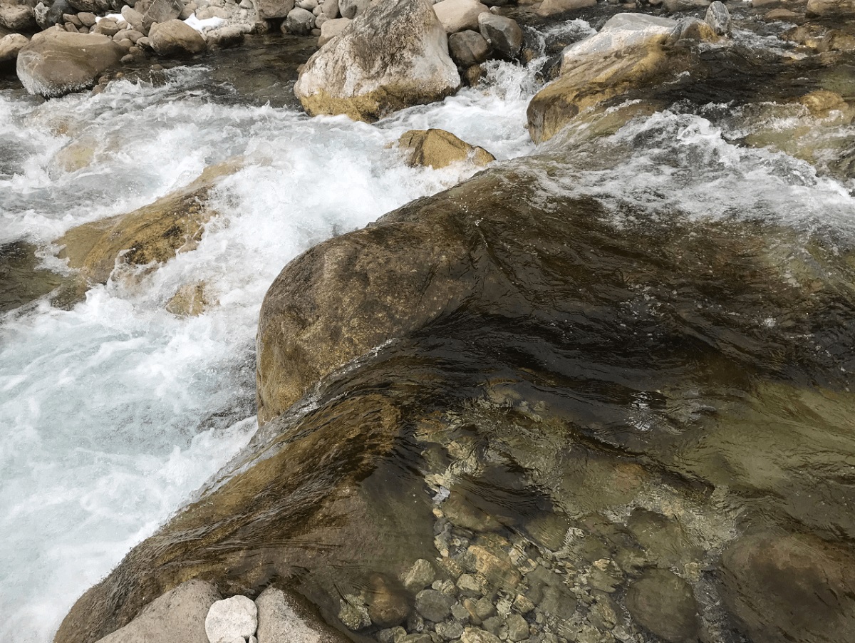 其次就是山間清泉,水清粼粼的,如絲綢般滑過(guò),河面上的小石頭和水相交,發(fā)出潺潺的流水聲。雖然刺骨,但是白水鑒心。